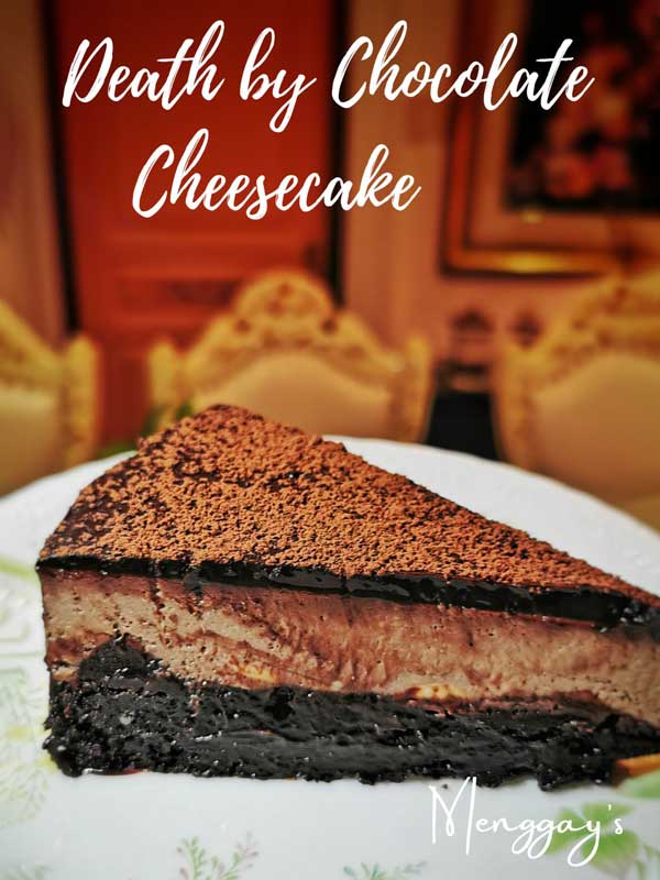Chocolate Brownie Crust, Chocolate Cheesecake Filling, Chocolate Chunks, Chocolate Ganache Topping, and Chocolate Powder